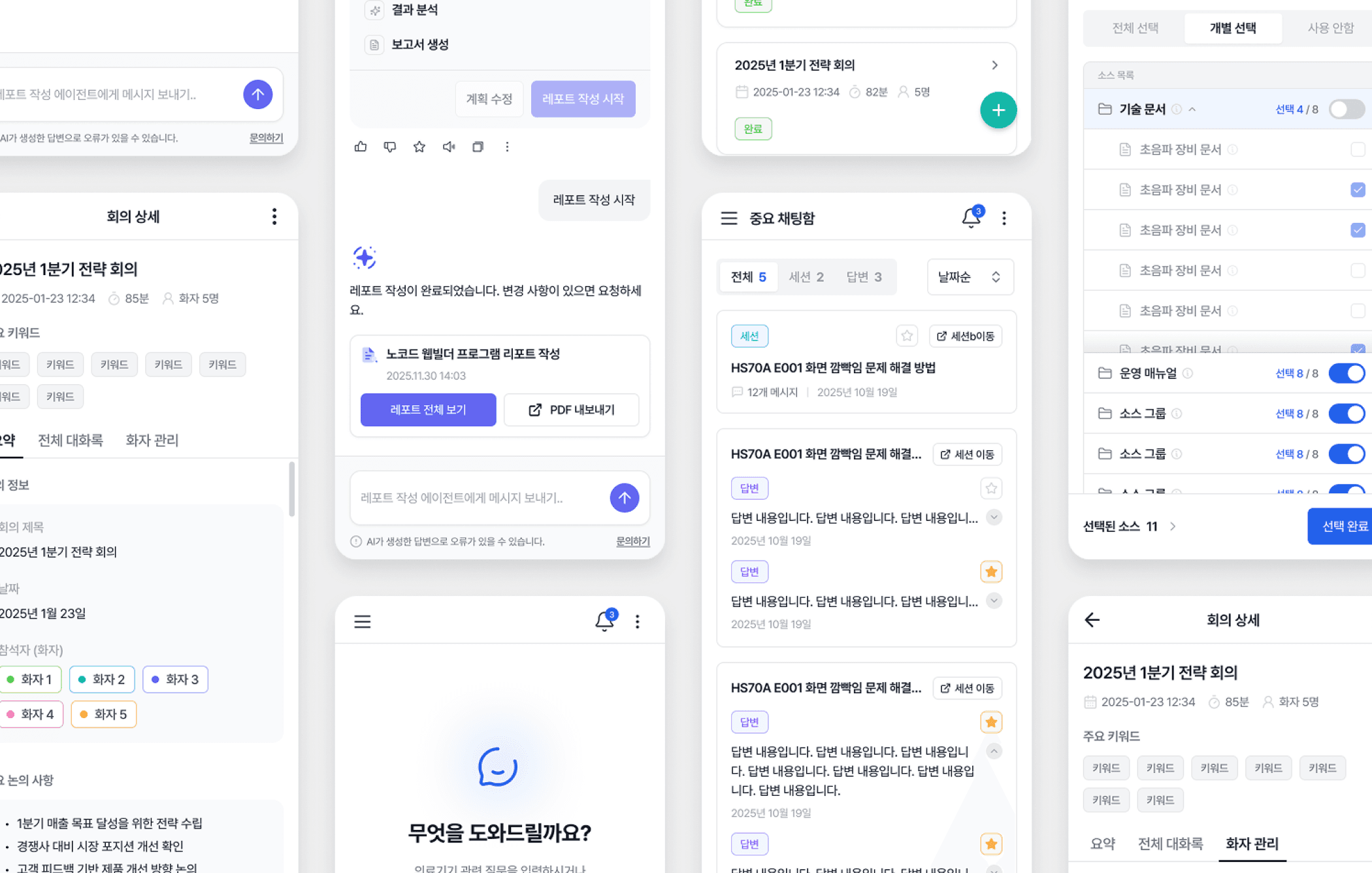 • 내부 문서 및 외부 데이터 기반 AI 질의응답 • 소스 선택 및 출처 확인이 가능한 채팅 UI • 회의록 요약, 리포트 생성 등 에이전트 기능 • 중요 채팅 및 대화 히스토리 관리 • 반응형 웹 기반 인터페이스