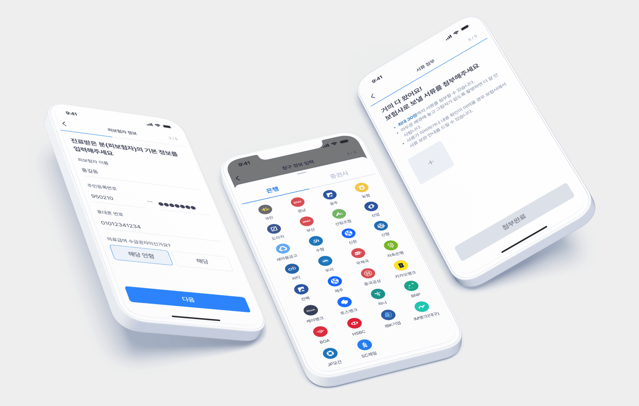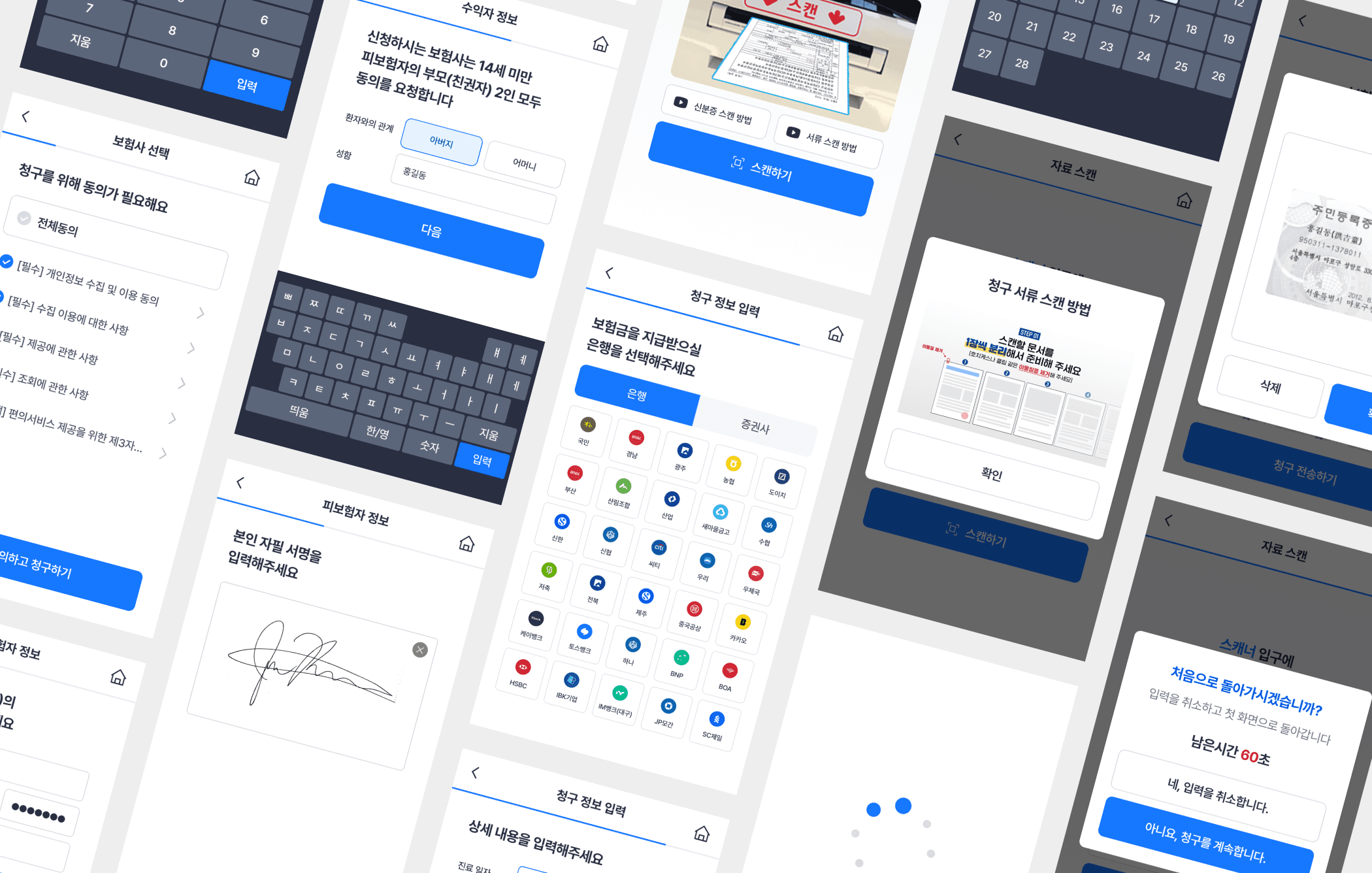 • 보험금 청구 유형 선택 (질병 / 상해 / 교통사고) • 보험금 청구 신청 및 진행 단계 안내 • 개인 상황에 맞춘 필요 서류 자동 안내 • 추가 서류 제출 기능 • 키오스크 기반 서류 스캔 및 전송 UX • 모바일 웹을 통한 서류 확인 및 보완 제출 • 병원 현장 사용성을 고려한 큰 버튼, 명확한 가독성 중심 UI