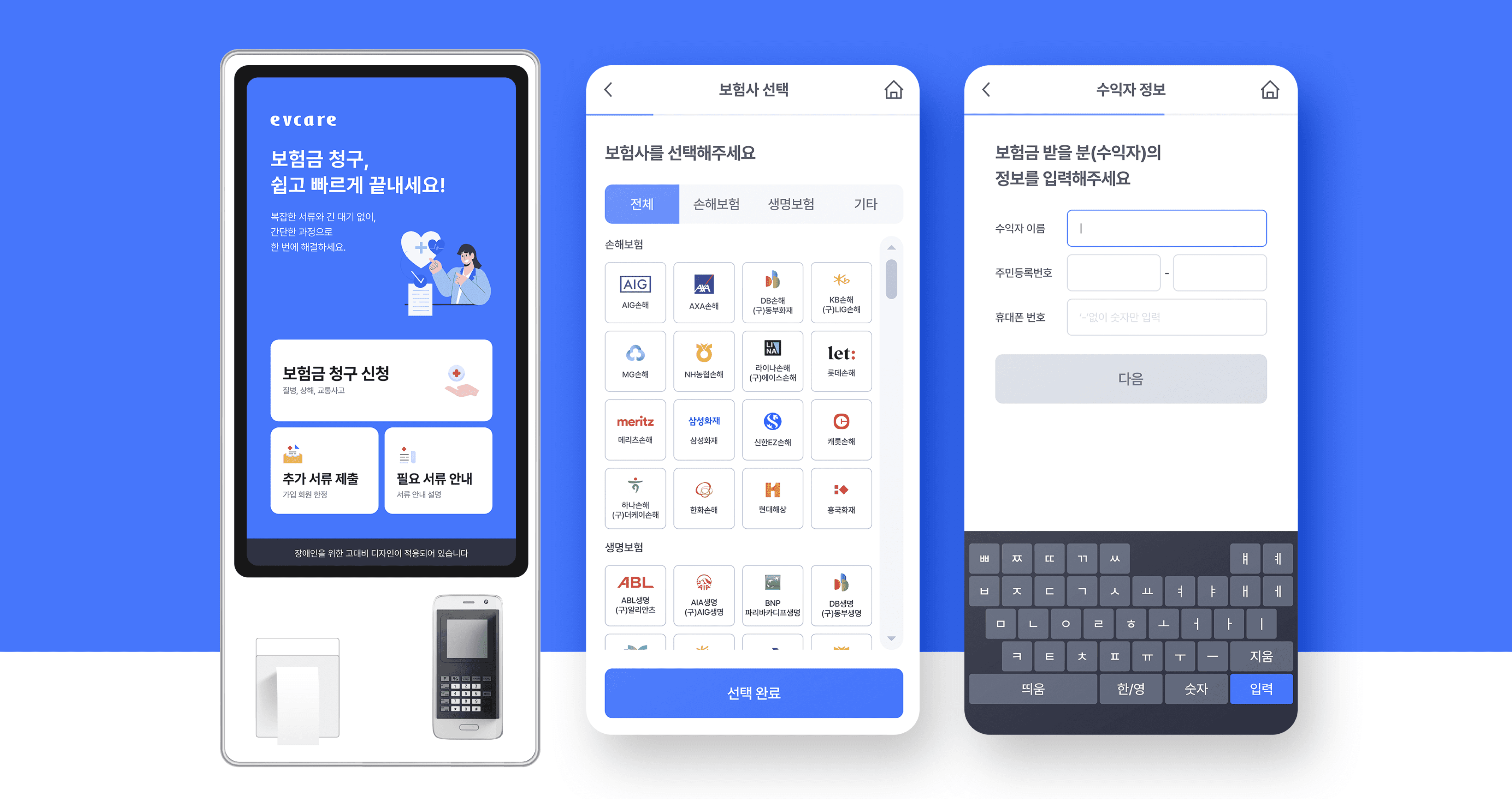 이브이케어(EV Care)**는 병원 내 키오스크와 모바일 웹을 통해 환자가 보험금 청구를 쉽고 빠르게 진행할 수 있도록 지원하는 UX/UI 프로젝트입니다. 질병, 상해, 교통사고 등 다양한 보험 청구 유형에 대응하며, 청구 신청부터 필요 서류 안내, 추가 서류 제출, 서류 스캔 및 전송까지 병원 현장에서 바로 처리할 수 있는 통합 보험 청구 경험을 제공합니다.