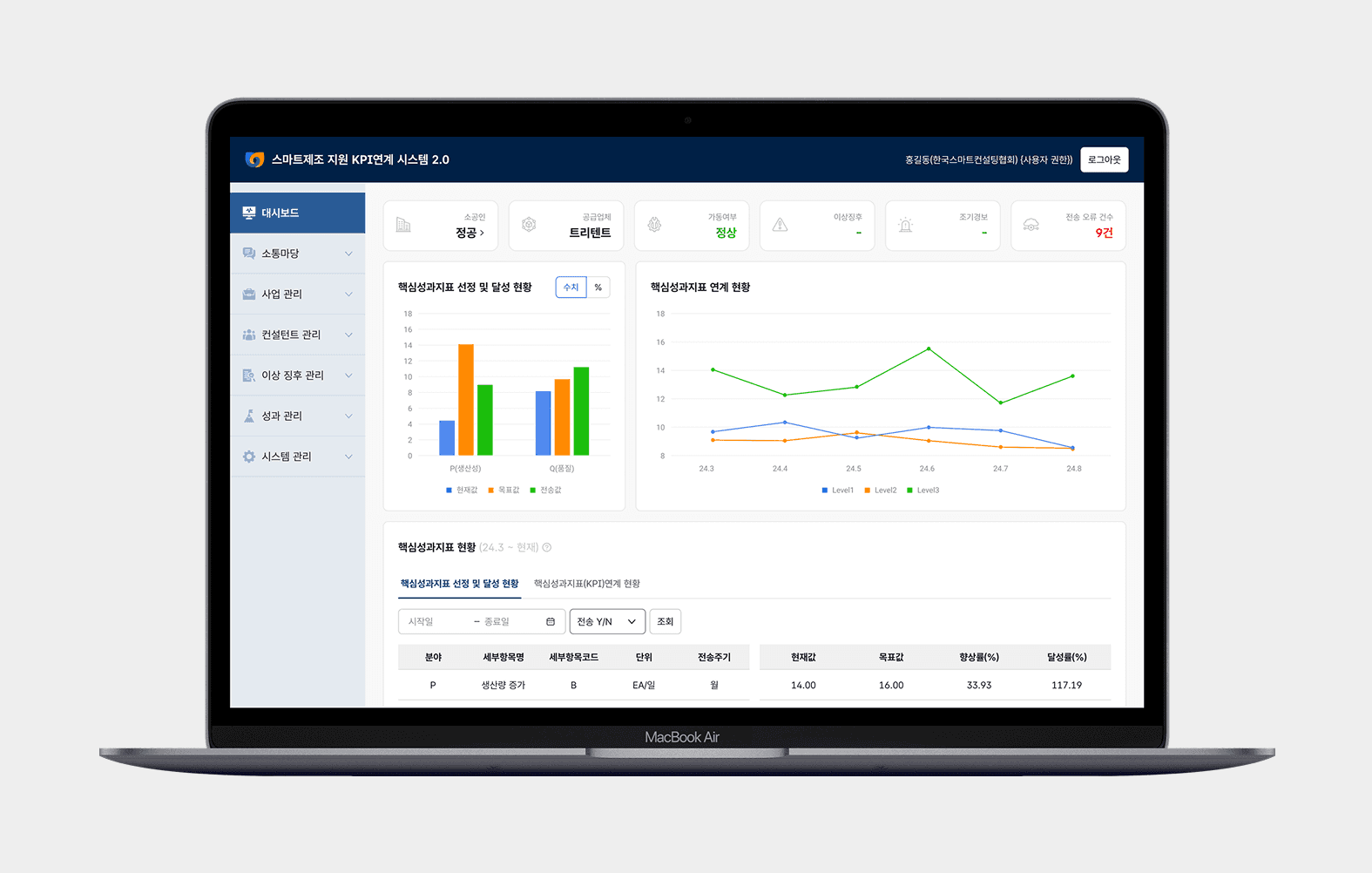 스마트 제조 환경에서 생산성과 품질을 효과적으로 관리하기 위해 구축된 KPI 연계 시스템입니다. 제조 공정에서 발생하는 데이터를 실시간으로 수집, 분석, 시각화하여 주요 성과 지표를 체계적으로 관리할 수 있도록 설계되었으며, 현장의 실무자부터 경영진까지 다양한 사용자가 즉각적인 의사결정을 할 수 있도록 지원합니다. 본 프로젝트는 스마트 팩토리의 운영 효율성과 데이터 기반 경영의 실현을 목표로 진행되었습니다.