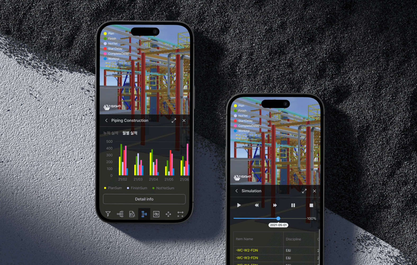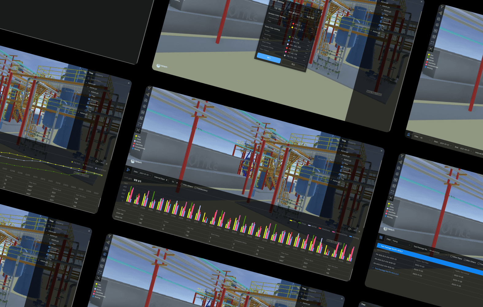 기존 설치형 4D 시뮬레이션 프로그램을 웹 기반 플랫폼으로 전환하고, UXUI를 전면 개선하여 사용자 친화성과 시각적 완성도를 향상시킨 프로젝트입니다. 플랜트 시공 단계에서 공정 계획과 실시간 진행 상황을 직관적으로 파악할 수 있도록 지원하는 것이 주요 목적이었습니다.